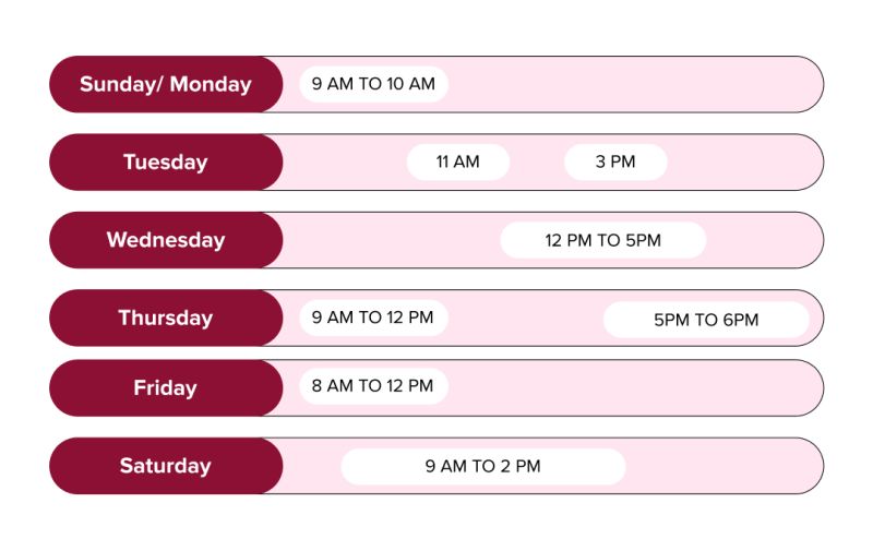 | Thứ Năm | 11h sáng – 1h chiều |